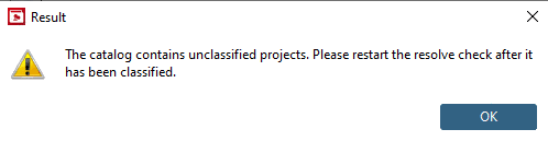 An initial Resolve check may take some time depending on catalog size. At further processes, if there were no or only little changes, the result is displayed after a few seconds, because only changed projects are tested.