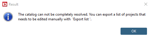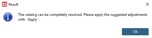After finished process a respective message is displayed whether the catalog could be completely resolved or not.