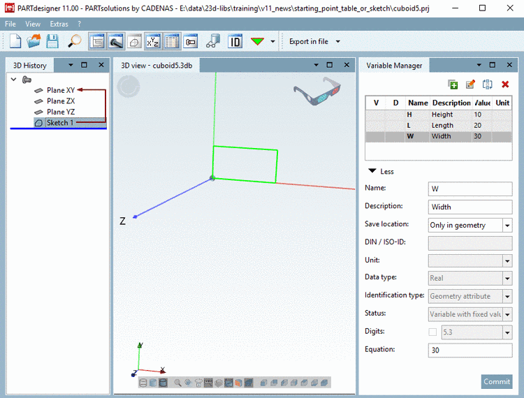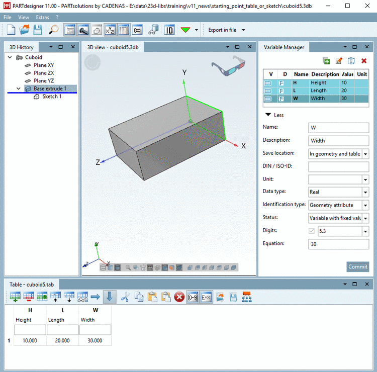 In the Variable Manager, create the variables L (Length), W (Width) and H (Height) for a cuboid. Details on the Variable Manager can be found under Section 7.8, “ Docking window "Variable Manager" ”.