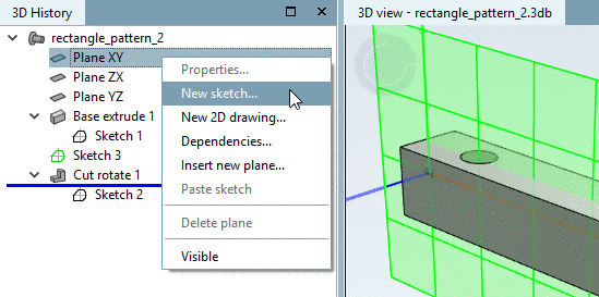 In the plane with the original boring for the pattern, via command New sketch..., create a new sketch.