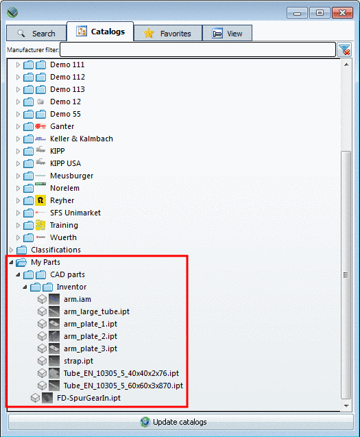 On the Catalogs tabbed page you can find the desired part via catalog, subdirectories structure extending down to the project file. Successively open the subdirectories. The decision symbol in the tree marks those folders which contain other folders or projects.
