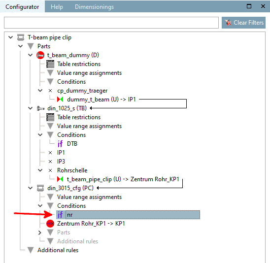 At the part "pipe clip" (din_3015_cfg (PC)), under Conditions, click on the context menu command Insert condition.