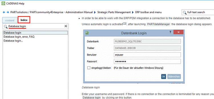 In the index view you will get an alphabetical listing of all index terms. Simply select the desired term, in order to display the respective help.