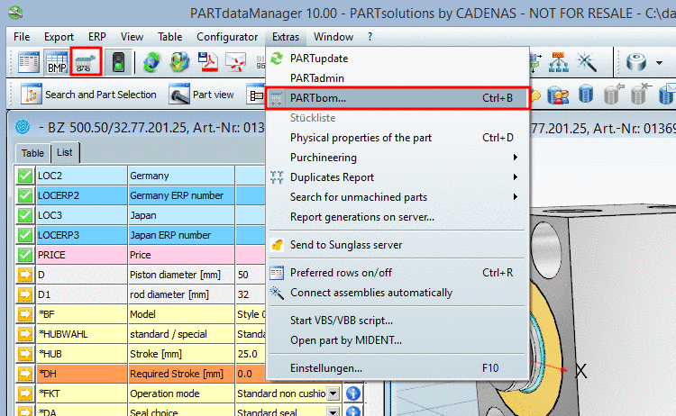 2. In the toolbar, click on the button Transfer to Bill of Materials (PARTbom) or in the Extras menu, click on the menu item PARTbom.