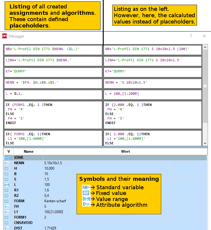 fornisce una panoramica di tutte le variabili create [Variables], dei relativi valori [Values], intervalli di valori [Value ranges] e algoritmi [Algorithms].