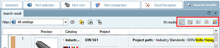 La modalità "Ricerca di singole parti" è particolarmente adatta per la ricerca geometrica (3D) [Geometric search (3D)], la ricerca di schizzi (2D) [Sketch search (2D)] e la ricerca topologica [Topology search]. Questa modalità è molto adatta anche per la ricerca nei cataloghi di pezzi proprietari, poiché in un progetto di classificazione vengono spesso combinati pezzi eterogenei con aspetto molto diverso. Questa opzione è utile per le ricerche full text [Full-text search], ad esempio se si utilizzano variabili di tabella specifiche o se la ricerca è combinata con una ricerca di variabili [Variables search] e la ricerca restituisce quindi caratteristiche specifiche. Cerca