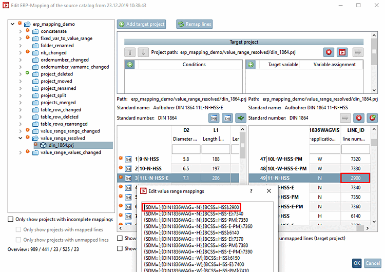 -> Si apre la finestra di dialogo Modifica assegnazione intervallo di valori [Edit value range mappings] con un elenco di tutte le combinazioni di valori (i singoli valori sono separati da punto e virgola). Alla fine di ogni riga si trova l'ID LINEA, separato da un punto e virgola.