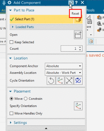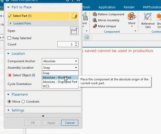 Open the list field under Assembly Location and select the option Absolute - Work Part.