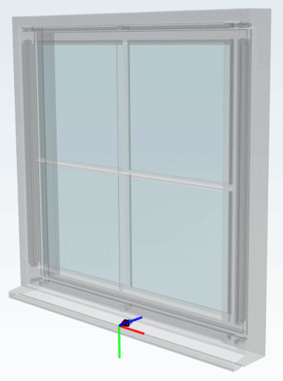 Il punto di connessione è rivolto verso la parete (Z), l'asse Y è rivolto verso il basso e l'asse X verso destra. Questo modello è identico a quello della porta, ma la finestra è posizionata al centro della parete.