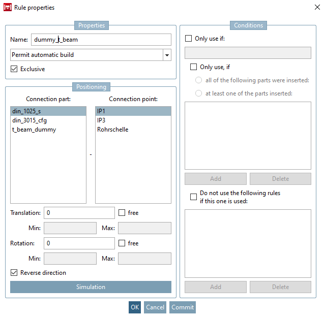 din_1025_s) e come Punto di attaccoIP1.Attivare Direzione inversa [Reverse direction] ed Esclusiva [Exclusive], selezionare Consenti montaggio automatico [Permit automatic build] nel campo elenco.
