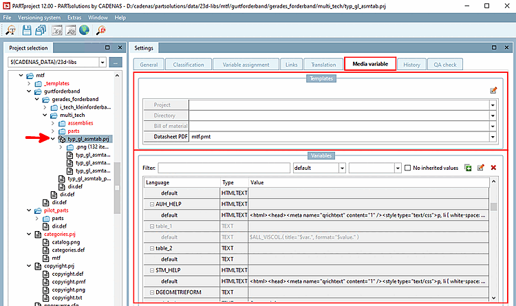 È possibile gestire le variabili dei supporti nella pagina della scheda Variabili dei supporti [Media variable] (fino alla V11 "Documenti"). Questi possono essere creati per vari scopi (PARTtemplateDesigner [funzione scheda tecnica PDF 3D], progetti di stampa, procedure guidate, configuratori di prodotto, PARTcommunity [ad es. informazioni aggiuntive sui suggerimenti]).