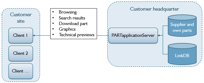 In un'installazione standard, le parti del produttore, le parti proprietarie e il database dei collegamenti sono accessibili solo tramite PARTapplicationServer. Azioni come la navigazione e la ricerca richiedono solo una piccola larghezza di banda. Per visualizzare i pezzi, i dati devono essere scaricati localmente, il che richiede una maggiore larghezza di banda a seconda della complessità dei pezzi.