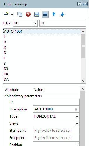 -> Nell'area di dialogo superiore appare una linea di quota "AUTO" e il tipo [Type] ORIZZONTALE [HORIZONTAL] viene creato per impostazione predefinita in Parametri obbligatori [Mandatory parameters]. (Nell'esempio è corretto. Altrimenti, regolare la selezione nella casella di riepilogo).