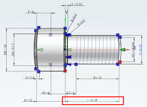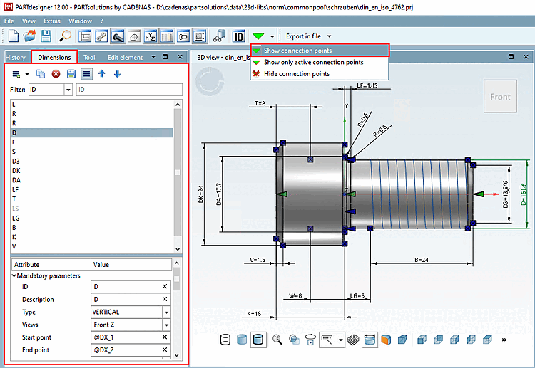 -> Non appena tutti i parametri obbligatori [Mandatory parameters] sono stati impostati, la quotatura appare nella vista 3D [3D view].