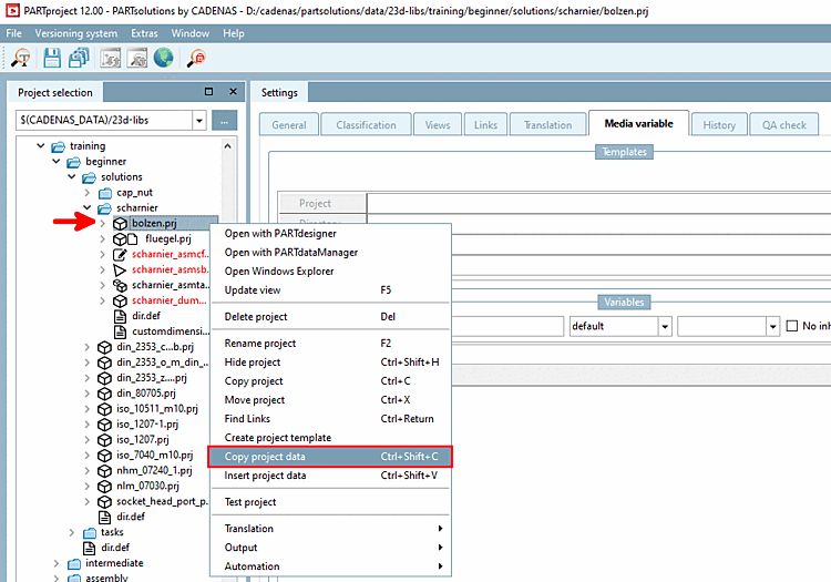 1. Selezionare il progetto che contiene i dati desiderati e richiamare il comando del menu contestuale Copia dei dati del progetto [Copy project data].