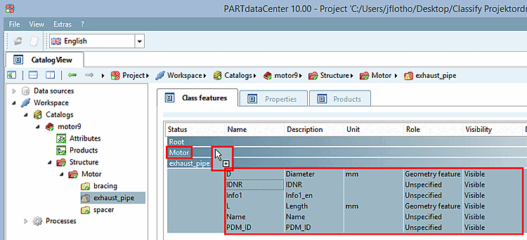 In questo esempio, le caratteristiche della classe sono state impostate per "Tubo di scarico", ma non per "Distanziatore" e "Supporto". Se si desidera impostare le stesse caratteristiche della classe "Tubo di scarico", è sufficiente spostarle nella classe "Motore", che si trova un livello più in alto nella gerarchia, utilizzando il drag & drop.