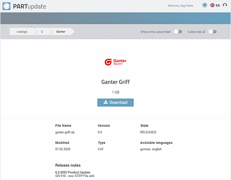 PARTupdate si apre non appena si effettua il login. Alla voce "cataloghi" si trovano cataloghi, classificazioni e informazioni sulle filettature, alla voce "iso" vari pacchetti software.