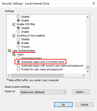 Nella finestra di dialogo "Impostazioni di sicurezza - Zona Internet" è necessario attivare l'opzione "Login automatico solo nella zona Intranet".