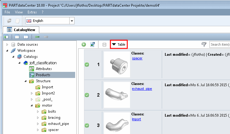 Nel tipo di visualizzazione Tabella [Table], tutti i nomi degli attributi sono elencati uno dopo l'altro in un unico campo. È inoltre possibile effettuare una ricerca testuale di tutti i prodotti. Il numero totale di tutti i prodotti è visualizzato in alto a destra.