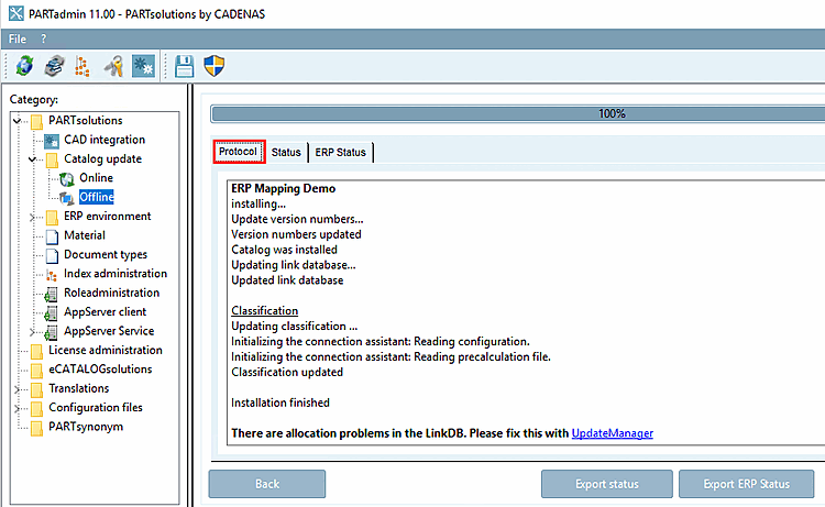 Al termine dell'installazione, vengono visualizzate le schede Protocollo [Protocol], Stato [Status] e Stato ERP [ERP Status], questa volta nell'area di dialogo standard Aggiornamento catalogo [Catalog update] -> Offline.