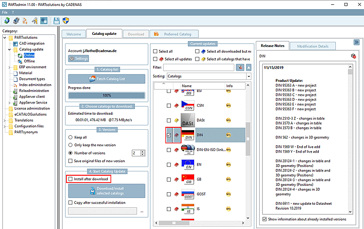 Se è stata disattivata l'opzione Installa dopo il download [Install after download] in Aggiornamento catalogo [Catalog update] -> Online, i file del catalogo scaricati si trovano ora nella directory [Download directory] temporanea di download [Download directory] specificata nella finestra di dialogo delle impostazioni.
