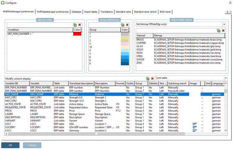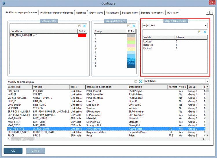For details see Section 4.9.7, “ Background color for ERP/PDM columns / plinkcommon.cfg -> Block [GROUP_COLORS] -> Key GROUP<number> ”.