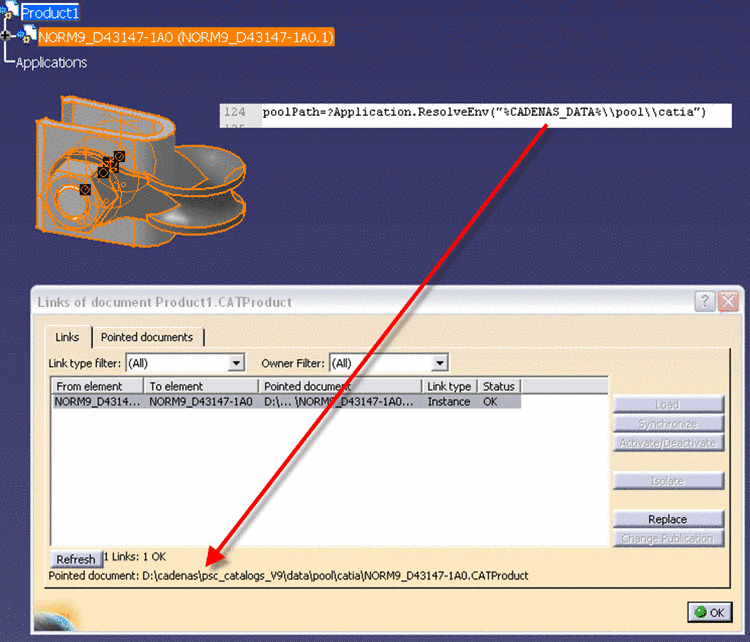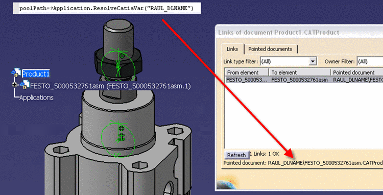 poolPath=?Application.ResolveEnv("C:\\data\\pool\\catia")Dialog box Links of document ... -> Tabbed page Links -> Pointed document: