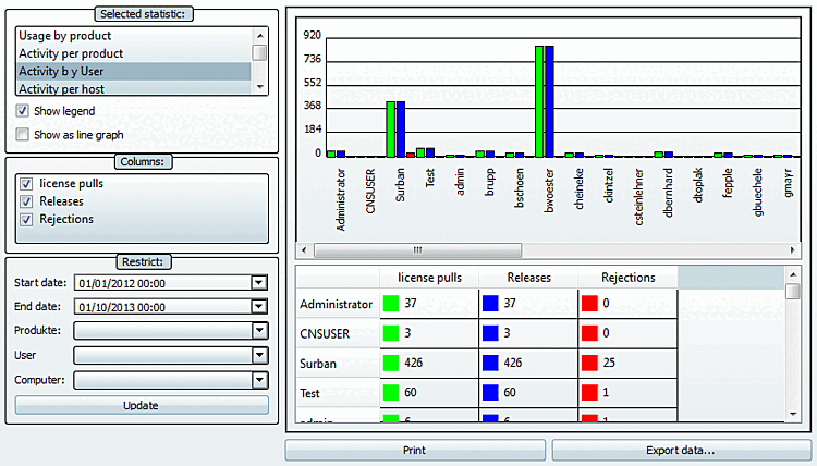 Questo tipo di statistica è particolarmente adatto per periodi più brevi, ad esempio dalle 7:00 alle 12:00 di un determinato giorno. È possibile riconoscere l'intensità della fluttuazione in relazione a un prodotto specifico. Una fluttuazione elevata conferma che la decisione di utilizzare le licenze fluttuanti è quella giusta.
