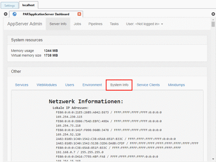 -> The PARTapplicationServer Dashboard is opened. (Directly after the first setup you can test the server's accessibility in this way.)