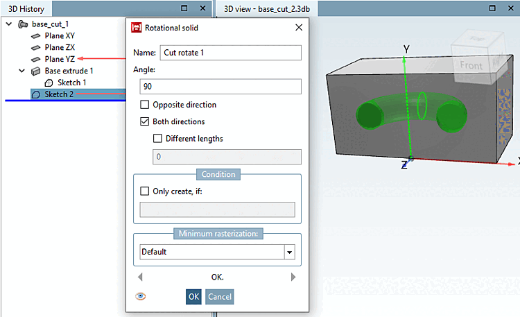 Nella cronologia 3D [3D History] sotto lo schizzo 2, selezionare il comando del menu contestuale Sezione [Cut] -> Ruota.... [Rotate...]