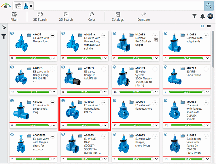Nei cataloghi dei produttori, non tutte le righe della tabella sono indicizzate per i prodotti, ma solo l'1% delle righe della tabella o almeno 3 righe (la prima, la centrale e l'ultima) nello stato di consegna. Se si utilizza la ricerca fotografica, solo queste righe vengono visualizzate nei risultati. Tuttavia, se si combina la ricerca fotografica, ad esempio con una ricerca testuale o variabile, vengono visualizzate le righe specificate; il valore di somiglianza geometrica non è reale, ma viene visualizzato il valore di somiglianza della riga più vicina dalla ricerca fotografica. È possibile riconoscerlo dal simbolo tilde e, al passaggio del mouse, dalle informazioni del tooltip.