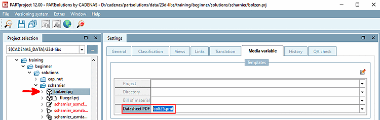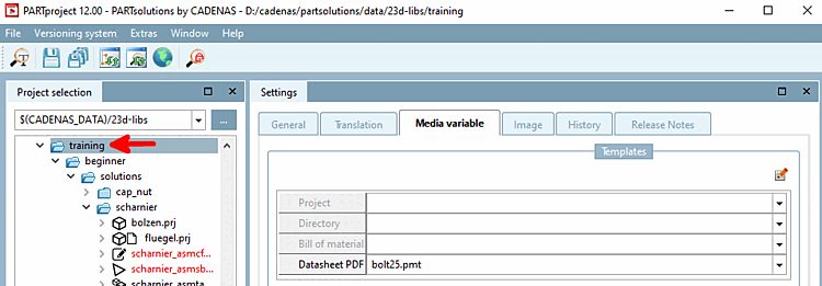 Situazione iniziale: un modello PDF di scheda tecnica, creato in PARTtemplateDesigner per un progetto di prova, deve essere ereditato dall'elemento principale del catalogo.