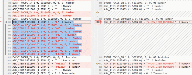 Transfer these lines into the recorded macro with the help of the used comparison tool; in above figure by clicking on the yellow arrow.