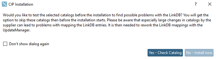 When starting a Catalog update with existing ERP integration the dialog box CIP Installation appears by default.