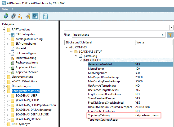 configuration file partsol.cfg, block INDEX:LUCENE, key TopologyCatalogs enter the