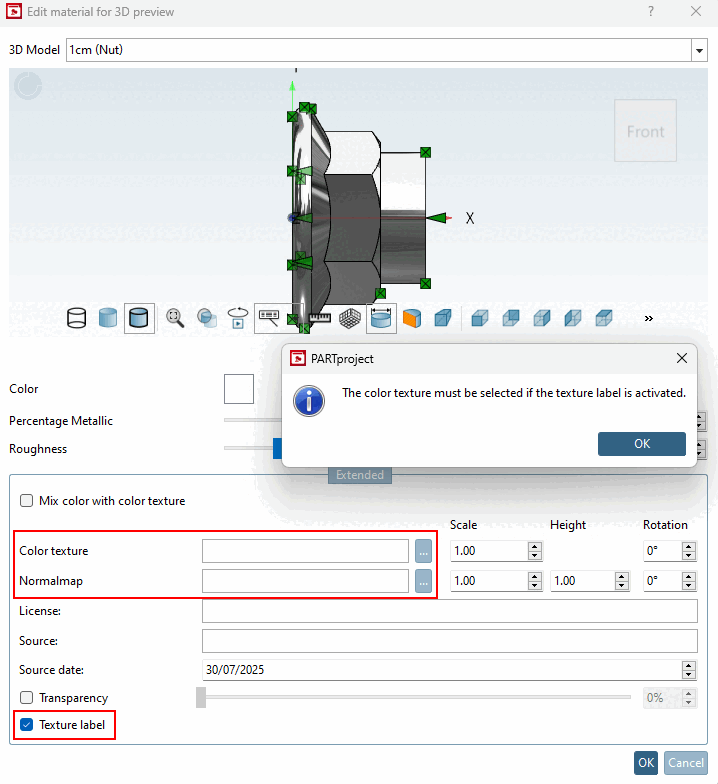 Attenzione: il colore desiderato deve essere ancora impostato, poiché a) la texture viene visualizzata solo nel software CADENAS (PARTdataManager, PARTproject, ...) e non può essere esportata nei sistemi CAD e b) il colore viene già visualizzato quando la texture è ancora in fase di caricamento all'apertura di una parte.