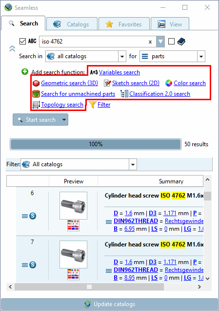 Per informazioni dettagliate sui singoli metodi di ricerca, consultare la sezione Sezione 3.1.6.4, “ Metodi di ricerca ” in ENTERPRISE 3Dfindit (Professional) - Utente.