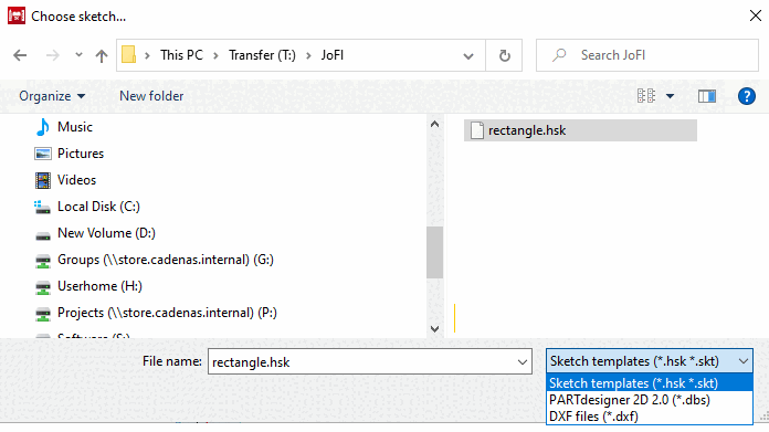 Essi può salvare modelli di schizzo (*.hsk) e disegni 2D (*.2db) e importare in seguito con