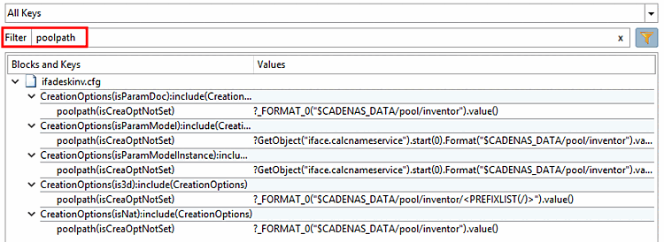Vengono ricercati i nomi dei file di configurazione, dei blocchi, delle chiavi e dei valori delle chiavi. Il termine di ricerca può trovarsi in qualsiasi posizione (all'inizio, alla fine, nel mezzo).