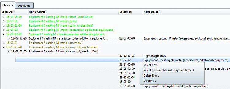 È possibile utilizzare la mappatura per trasferire le informazioni sulle classi di un sistema di classificazione a un altro sistema di classificazione. Ad esempio, è possibile mappare un sistema di classificazione creato da voi stessi a uno esistente o classificare un catalogo già classificato secondo eClass 5.1 in eClass 6.0 in modo relativamente semplice.
