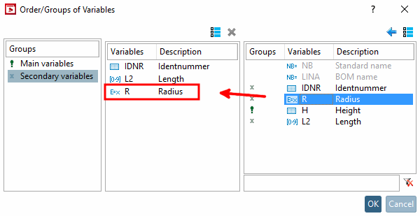 Fare clic in PARTproject sotto Modifica progetto [Edit project] -> scheda Generale [General] -> sezione Variabili [Variables] -> Sequenza/gruppi di variabili [Order/Groups of Variables] sul pulsante .
