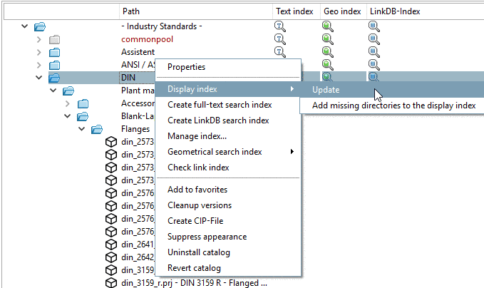 The display index is needed for saving or display of the directory structure. It has to be available in order for catalogs to be displayed in PARTdataManager. Other indices are optional for PARTdataManager functionality (however, useful in order to be able to use both Full-text search and the different geometrical search methods).
