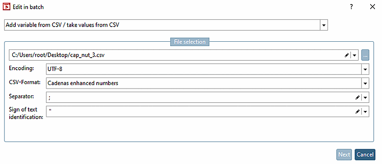 Selezionare l'opzione Aggiungi variabile da CSV/Accetta valori da CSV [Add variable from CSV / take values from CSV].