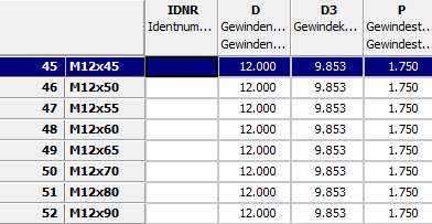 IDNR;NENN;DG;GK;DA;DK;DW;X;H;M;S;T Identifikationsnummer;Zeilenbeschreibung;Gewindenenndurchmesser;...;.....;... ;;mm;mm;mm;mm;mm;mm;mm;mm;mm;mm T;T;Z;Z;Z;Z;Z;Z;Z;Z;Z;Z 1;M4;4;3.242;4.6;6.5;5.8;1.4;8;3.2;7;5.26 2;M5;5;4.134;5.75;7.5;6.8;1.6;10;4;8;7.21 3;M6;6;4.917;6.75;9.5;8.3;2;12;5;10;7.71 4;M8;8;6.647;8.75;12.5;11.3;2.5;15;6.5;13;10.65 5;M10;10;8.376;10.8;15;14.3;3;18;8;16;12.65