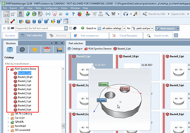 Aprire PARTdataManager. Il catalogo creato con PLM Synchro è ora visualizzato nella vista parti [Part view] in Struttura [Structure] -> Cataloghi [Catalogs].