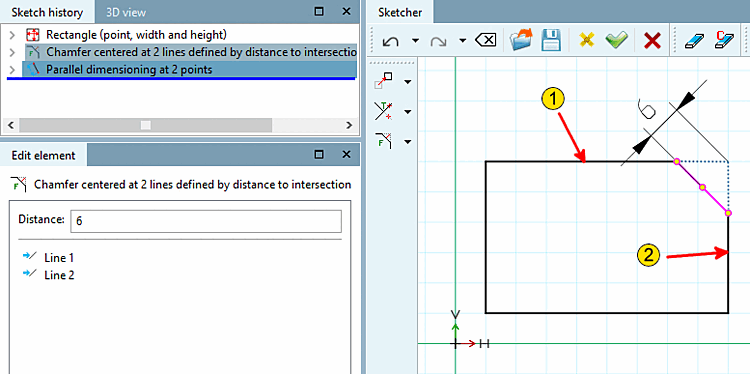 Selezionare la funzione di smussatura centrata su 2 linee su 2 lunghezze di avanzamento [Chamfer centered at 2 lines with 2 distances].