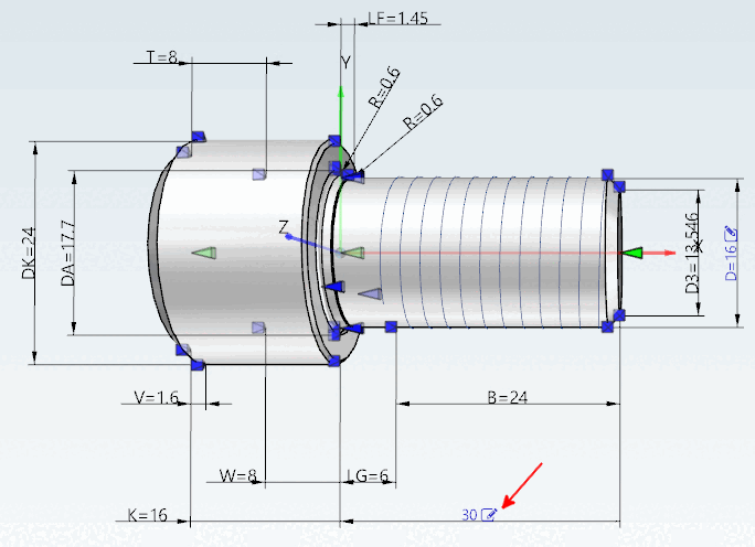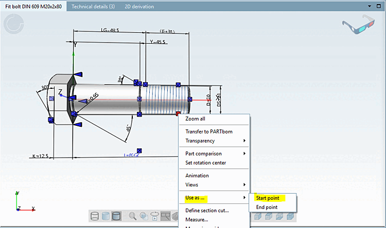 -> Non appena tutti i parametri obbligatori [Mandatory parameters] sono stati impostati, la quotatura appare nella vista 3D [3D view].