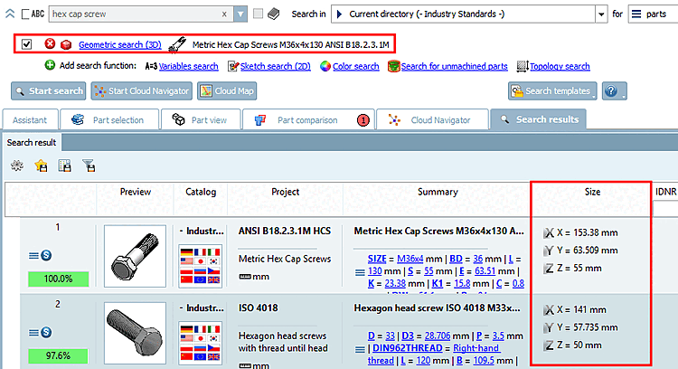 L'opzione Dimensione attiva la colonna Dimensione, ma solo per la ricerca geometrica (3D) [Geometric search (3D)].