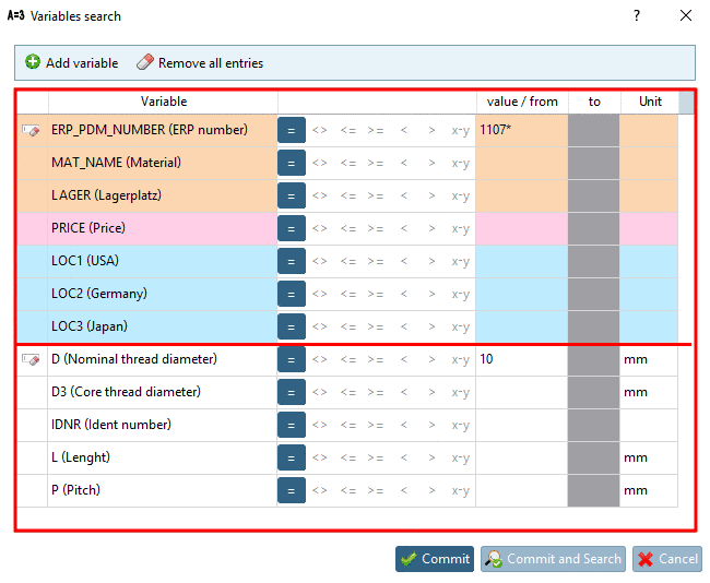 ERP-Variables are always displayed in the dialog box (when using an ERP integration). With these variables you can search catalog-spanning.