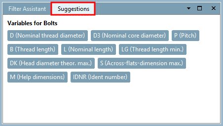 Furthermore the common geometrical variables of a selected directory level are displayed. The above figure is exemplarily showing the common variables of Norm -> JIS -> Bolts - Screws - Nuts - Washers - Screws -> Screws.